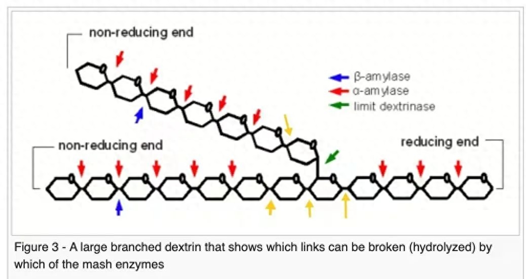α-淀粉酶这把剪刀在水解淀粉时,只能剪断下图中红箭头处的键,却不能剪断蓝色、绿色和黄色箭头的键。所以,即使α-淀粉酶这把剪刀失效,还会有别的剪刀剪断淀粉进行分解。